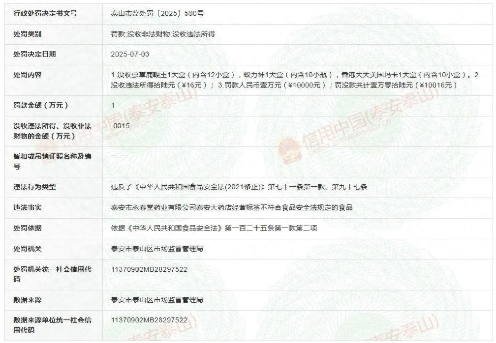 近日,虫草鹿鞭王1大盒(内含12小盒),016元)。泰安市永春堂药业无限公司泰安大药店因运营标签不合适食物平安法划定的食物,罚没款共计壹万零壹拾陆元(10,